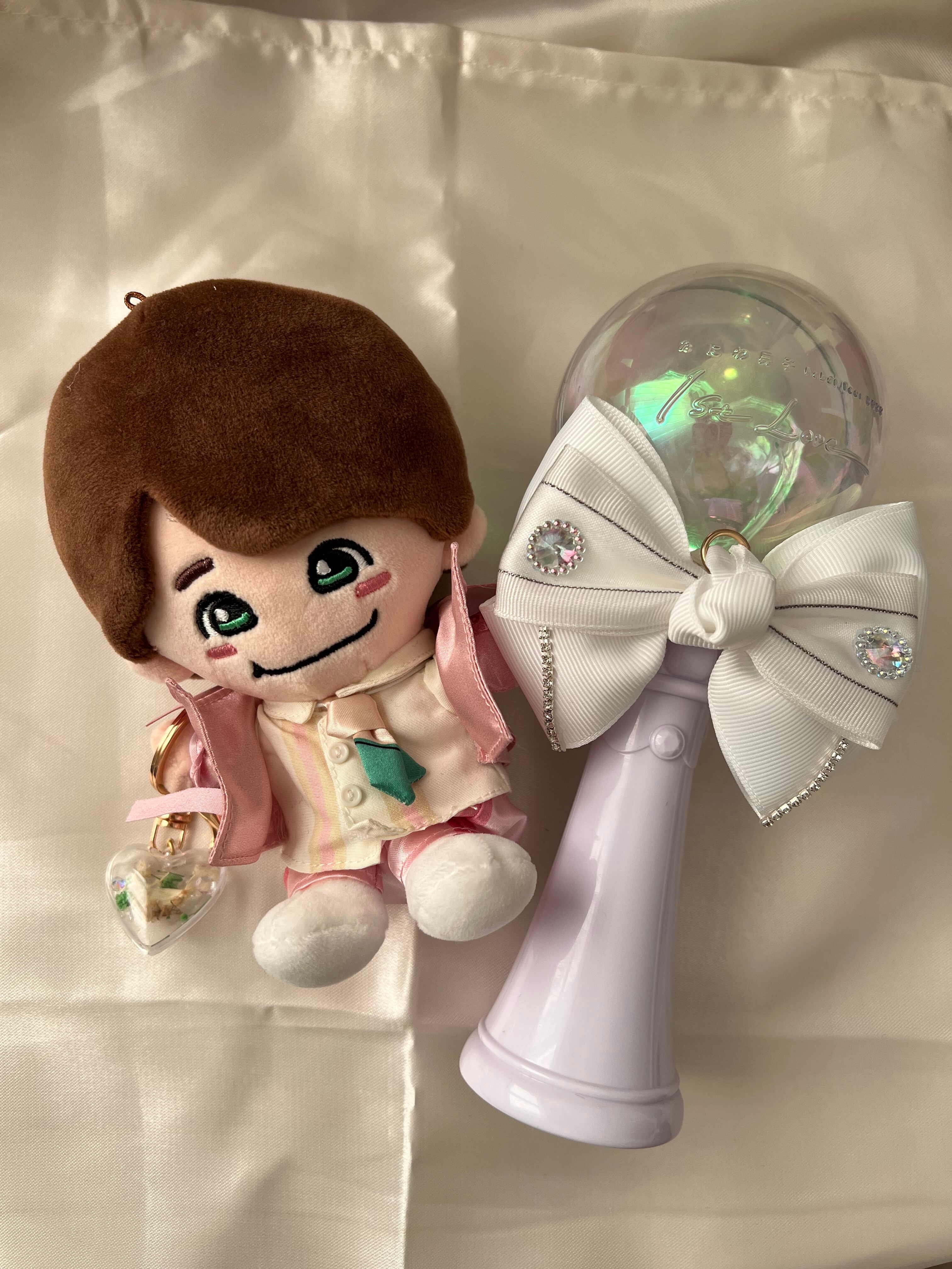 スペキス白衣装のリボンです、こちらはペンライト用に出来るミニゴムと丸カン、キーホルダーパーツとメンカラフラワーのハートカプセルパーツがついた商品です。
