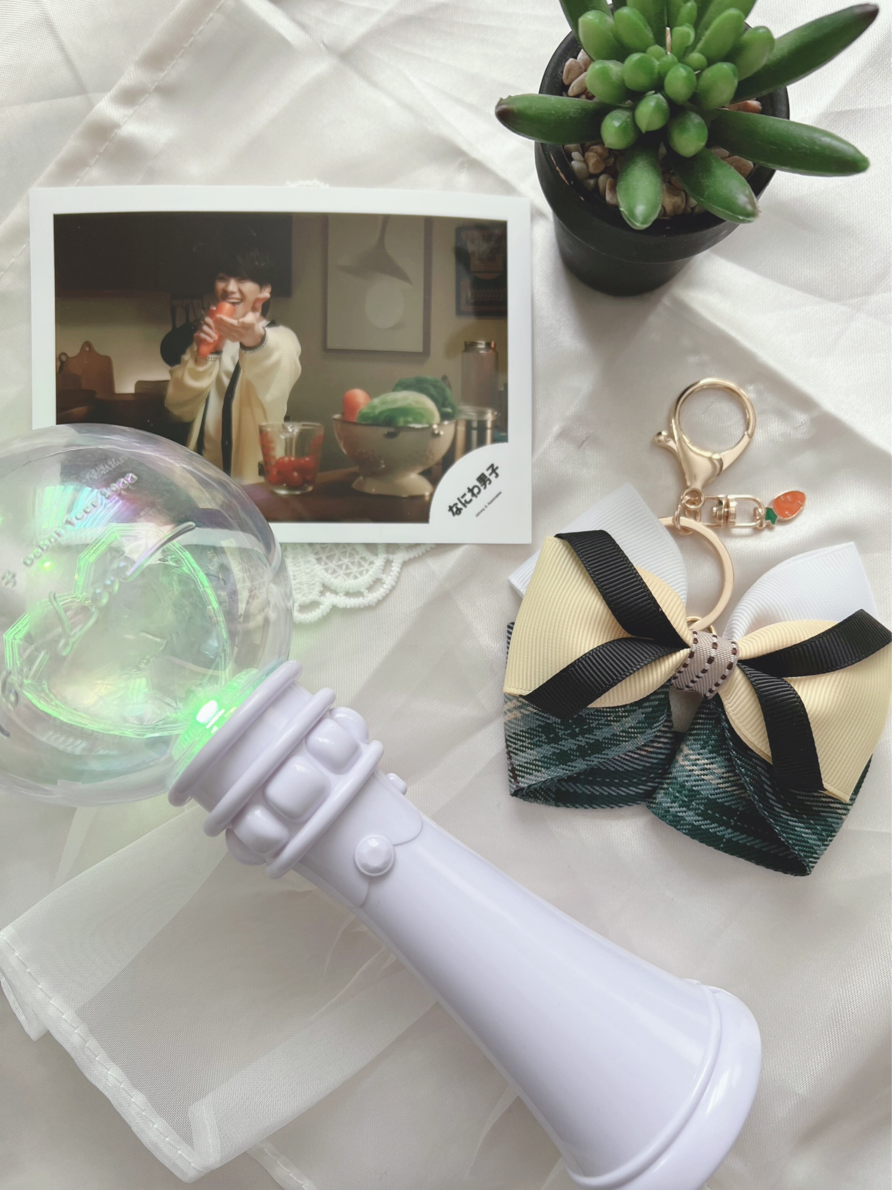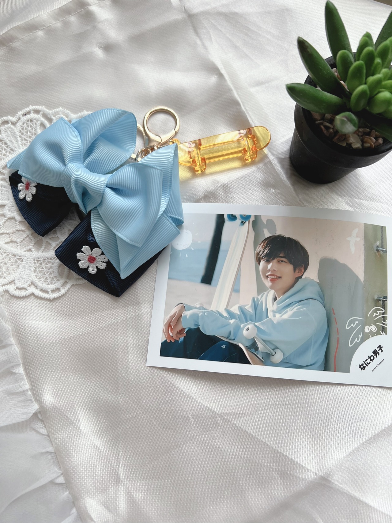 ⑥大西流星くん、白シャツ×透かし編みのニットベストをイメージしたリボンにネイビーボトムで衣装をイメージ。アクセントの観葉植物チャームがワンポイント!