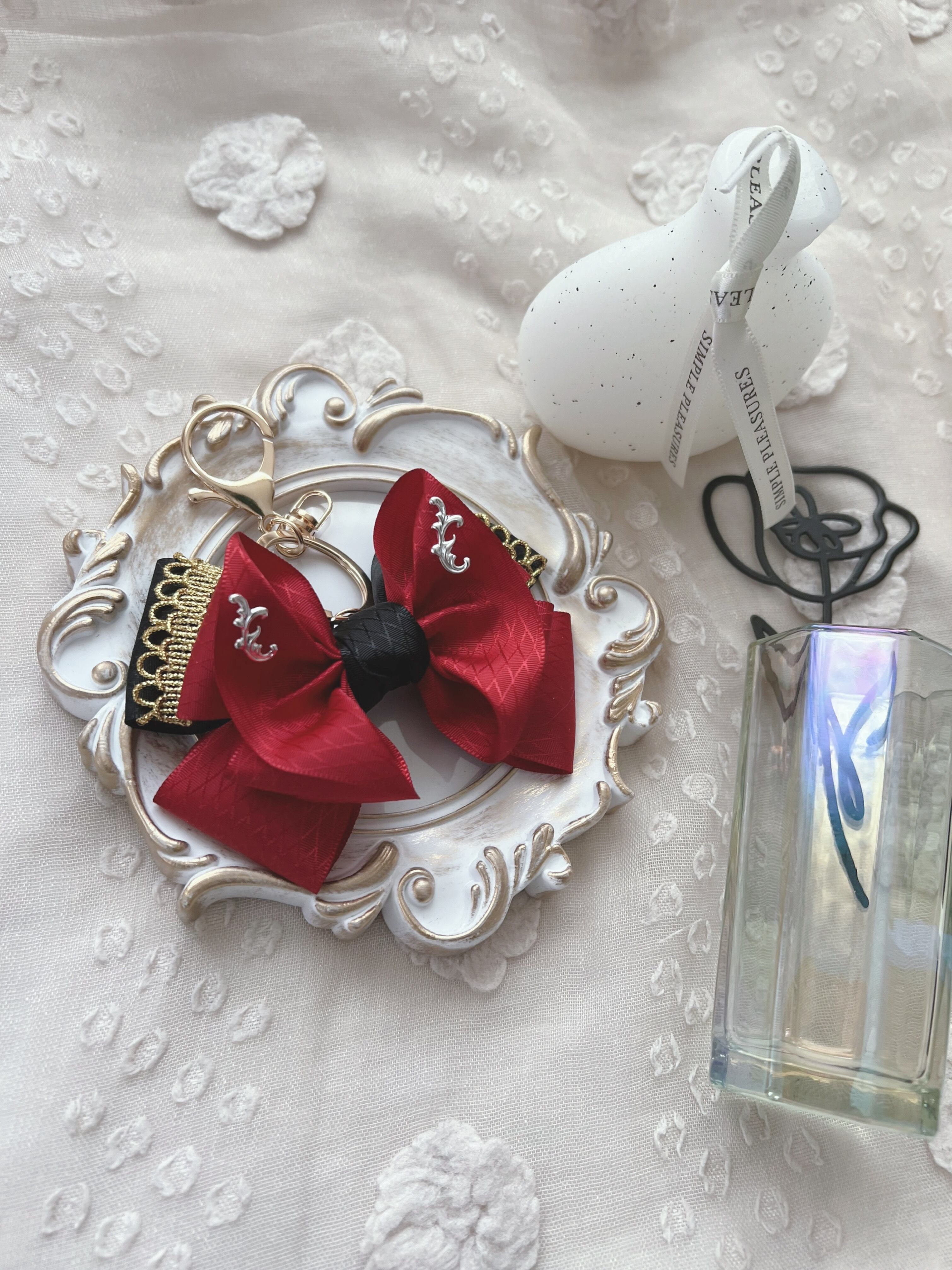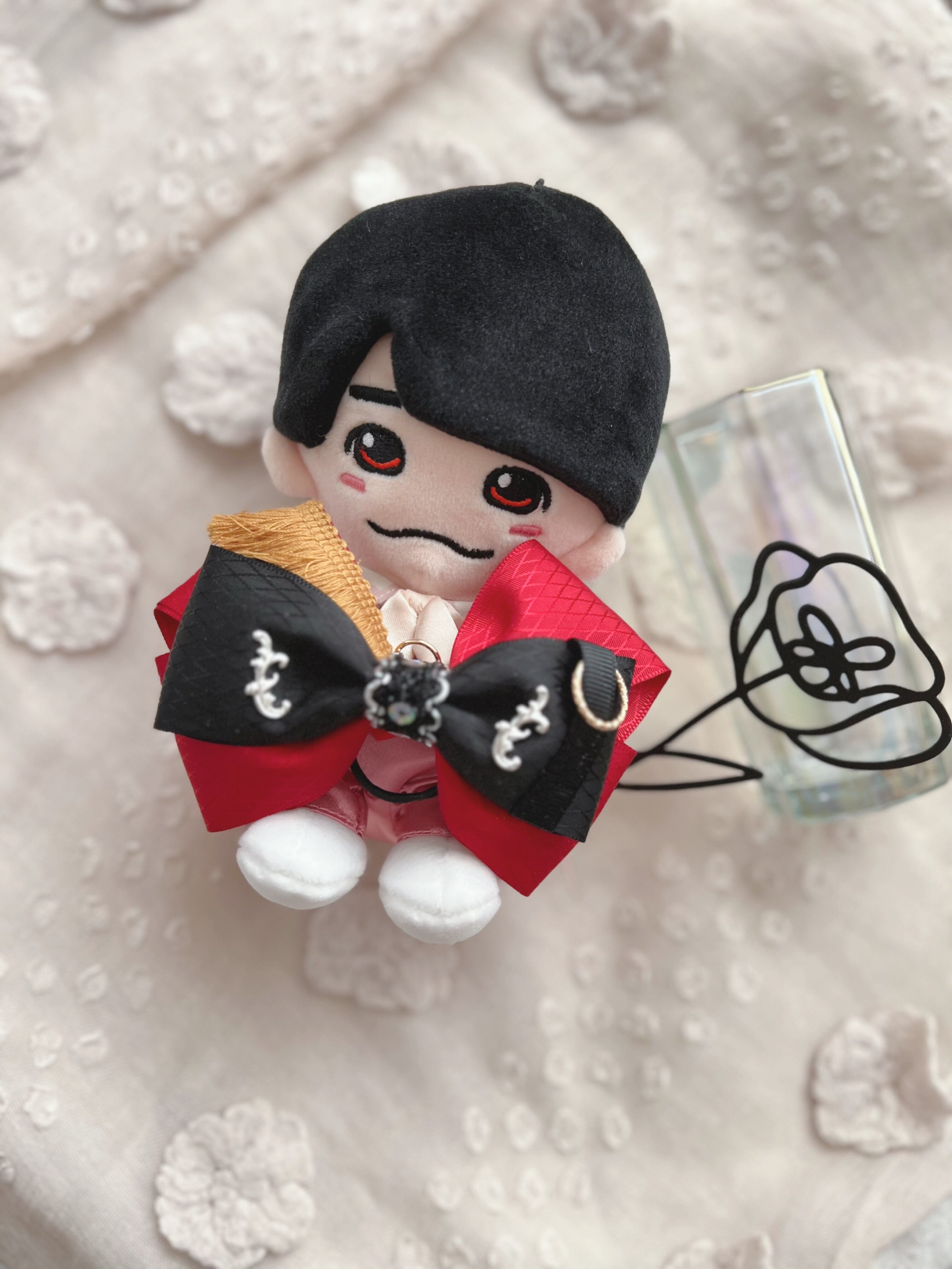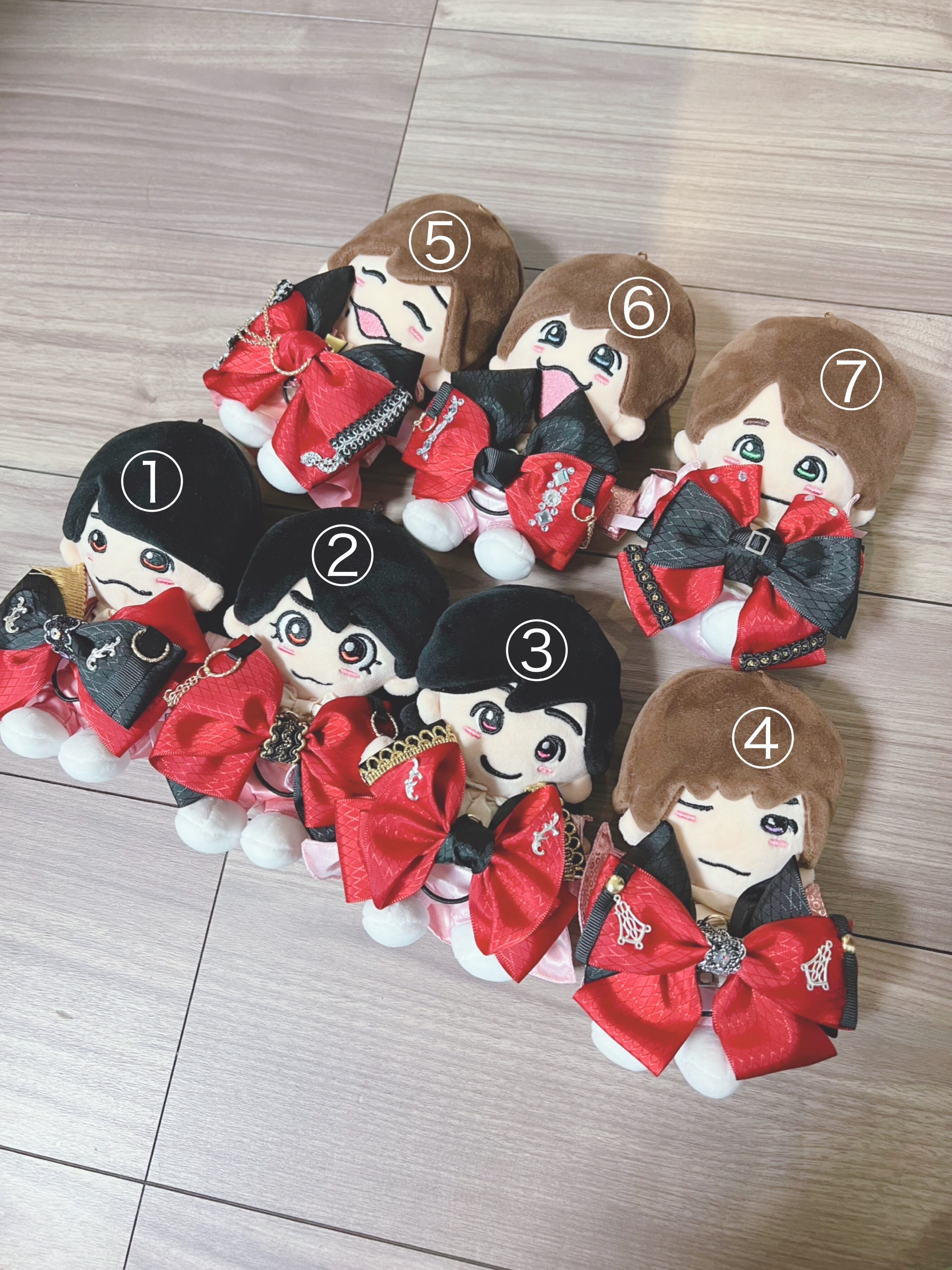 なにわ男子1stloveのライブ衣装、The Answerの赤黒衣装リボンです。ベースのおリボンも高級感のあるダイヤ柄型押しのリボンを使用。そこに各メンバーの衣装デザインのパーツやキラキラのブレードリボンを加えて曲のイメージが伝わるおリボンです。